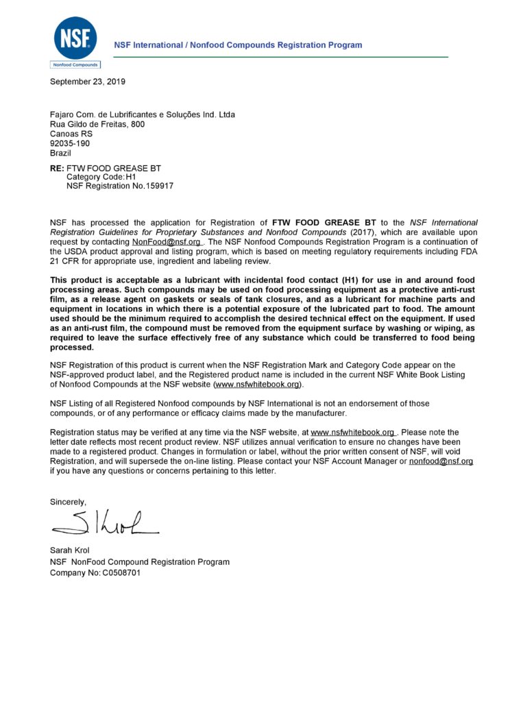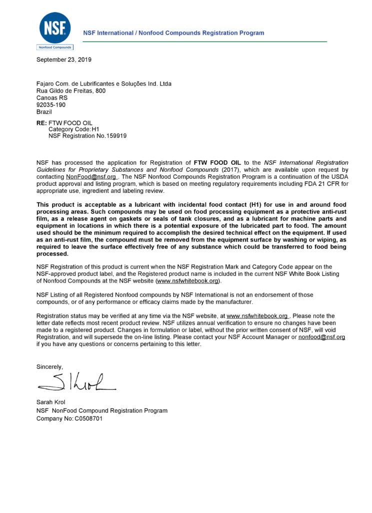 A Fajaro Lubrificantes Especiais aprimora seus processos de acordo com as necessidades dos seus clientes. Temos produtos com certificação NSF.